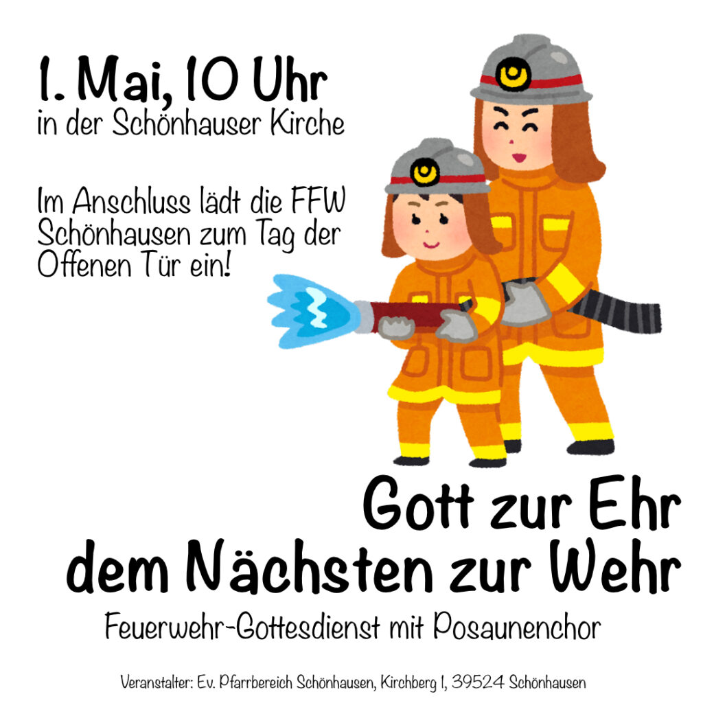 Herzliche Einladung zum Feuerwehrgottesdienst am 1. Mai in Schönhausen. 10 Uhr geht es in der Kirche St. Marien und Willebrord los. Im Anschluss lädt die Feuerwehr zum Tag der Offenen Tür ein.